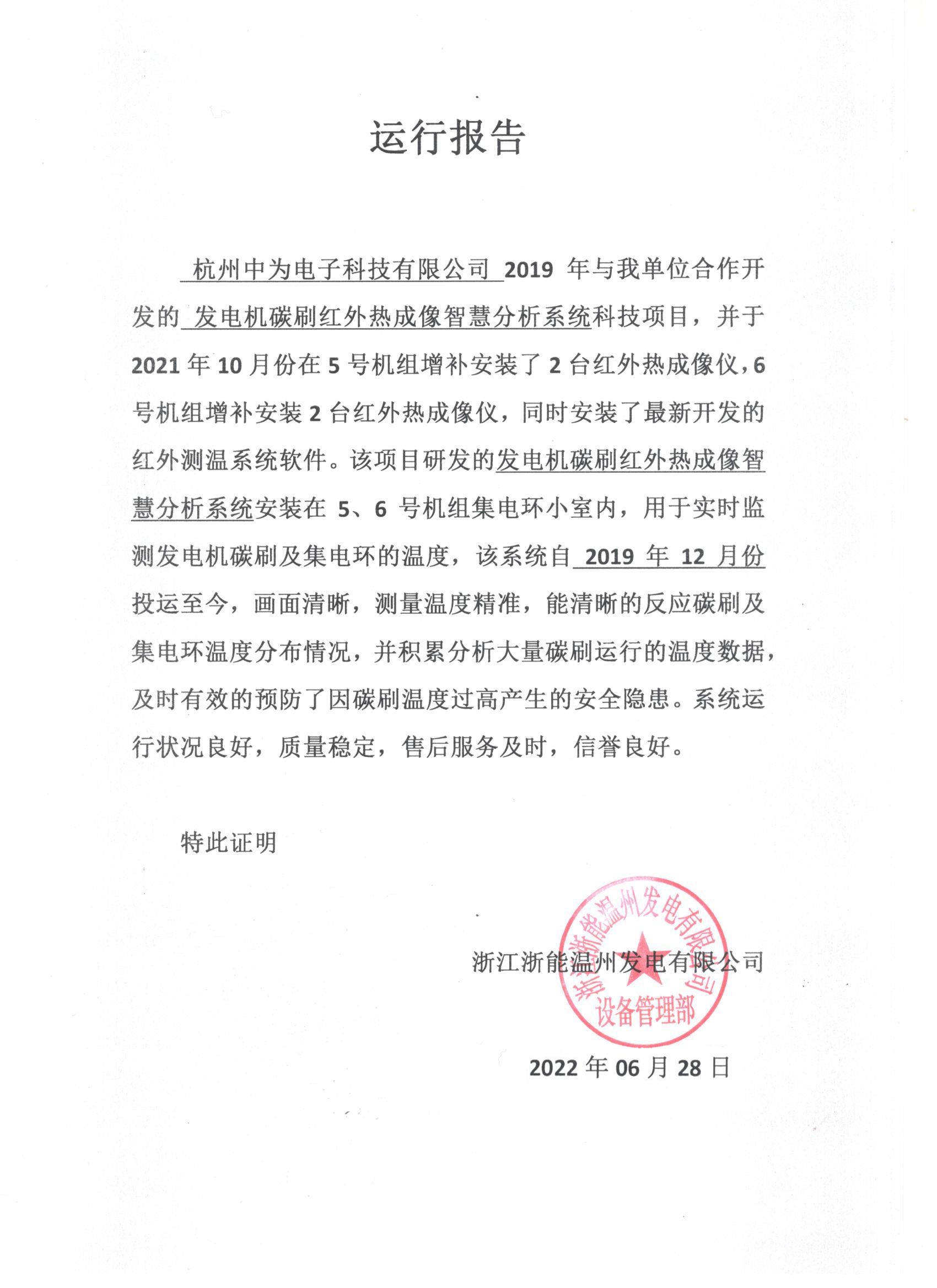 浙江浙能溫州發(fā)電有限公司5、6號機組加裝發(fā)電機碳刷紅外熱成像智慧分析系統(tǒng)