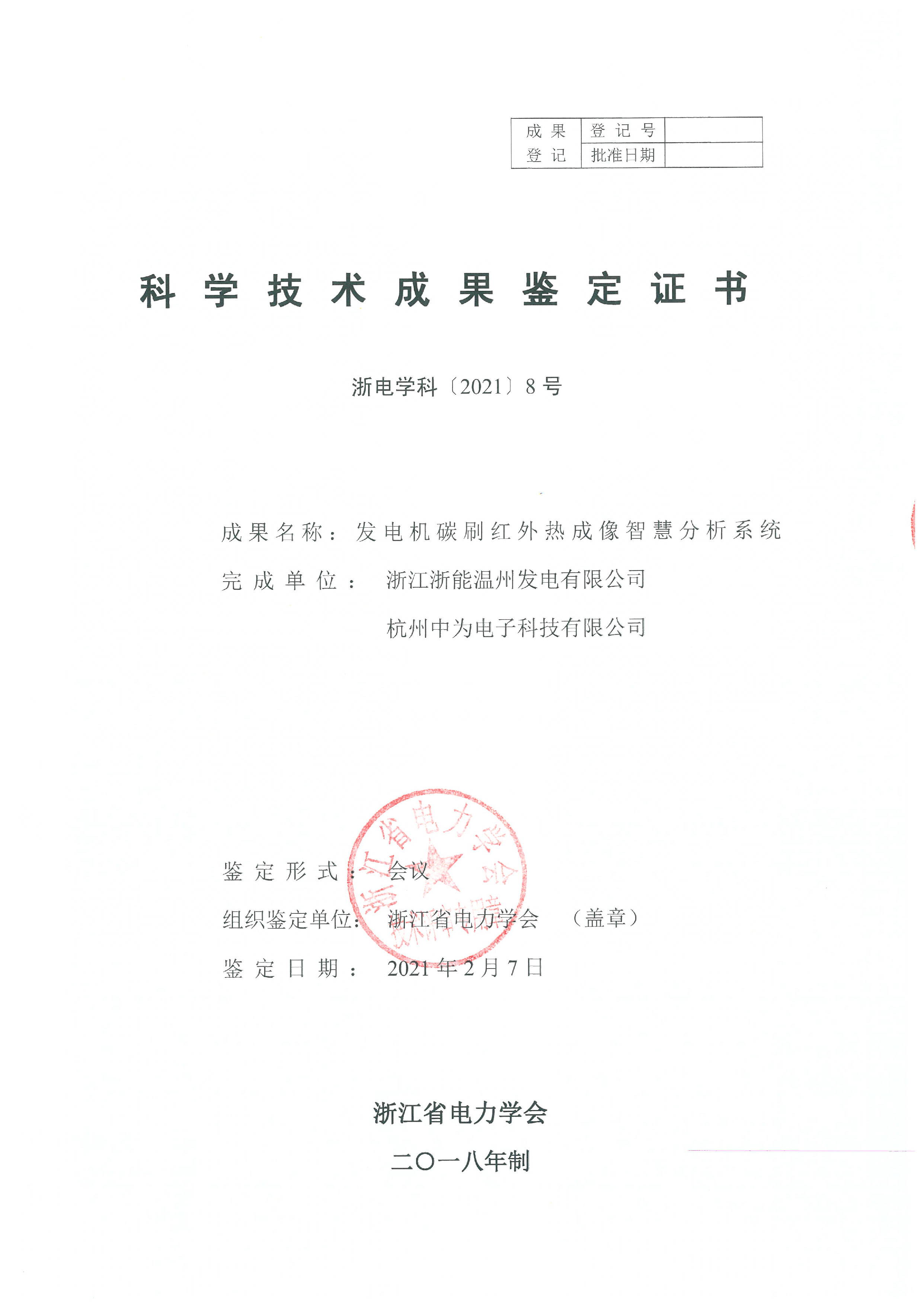2021年2月7日,杭州中為電子科技有限公司牽頭浙江省電力學會相關專家在杭州市主持召開了浙江浙能溫州發電有限公司與杭州中為電子科技有限公司的合作項目《發電機碳刷紅外熱成像智慧分析系統》科技項目成果鑒定。經鑒定委員會專家的鑒定,一致同意該科技項目通過科技成果鑒定。浙能溫州電廠技術總監翁獻進、杭州中為電子科技有限公司技術部潘明澤共同為委員會做專項成果技術介紹,詳盡的為與會專家闡述了項目的關鍵技術和創新點。