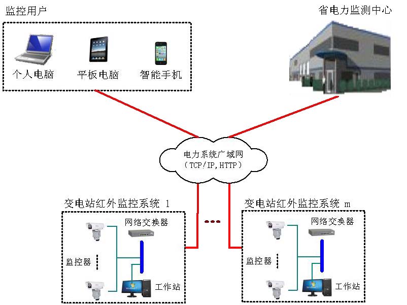 基于紅外熱成像的電力變電站遠程監(jiān)控系統(tǒng)由全天候高性能雙通路監(jiān)控頭(紅外熱成像+CCD)與相應的計算機網絡組成,系統(tǒng)采用了先進的計算機壓縮技術與網絡傳輸技術,只需通過RJ45標準以太網通訊接口,僅用“一根網線,一個IP地址”就可實現(xiàn)遠程對雙視監(jiān)測器控制(焦距、溫度校正)、傳輸紅外和可見光視頻、傳輸測溫數(shù)據(jù)、控制云臺。