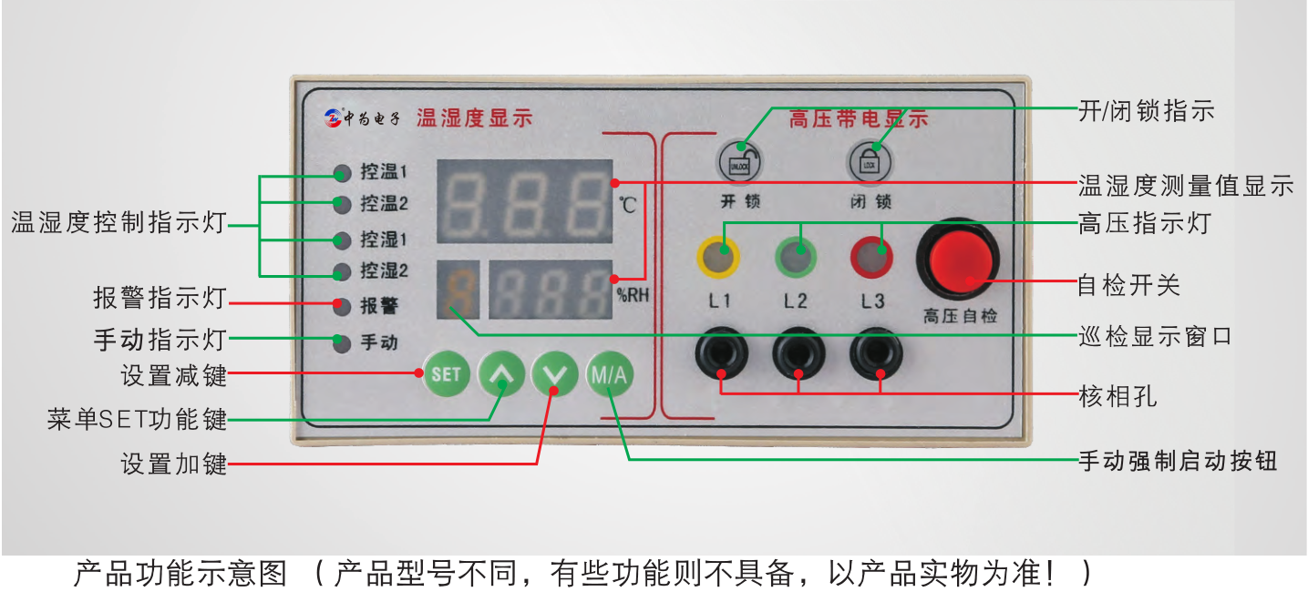 4、自檢開(kāi)關(guān):顯示器電源接通后,無(wú)論高壓側(cè)是否帶電按下自檢開(kāi)關(guān),顯示器自檢功能啟動(dòng),三相高壓燈點(diǎn)亮,閉鎖燈點(diǎn)亮,