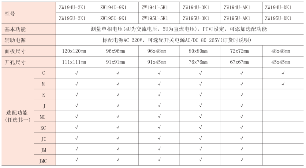 注:“√”代表可選配置,“J”代表報(bào)警輸出,“M”代表模擬量輸出,“K”代表開(kāi)關(guān)量輸入,“C”代表